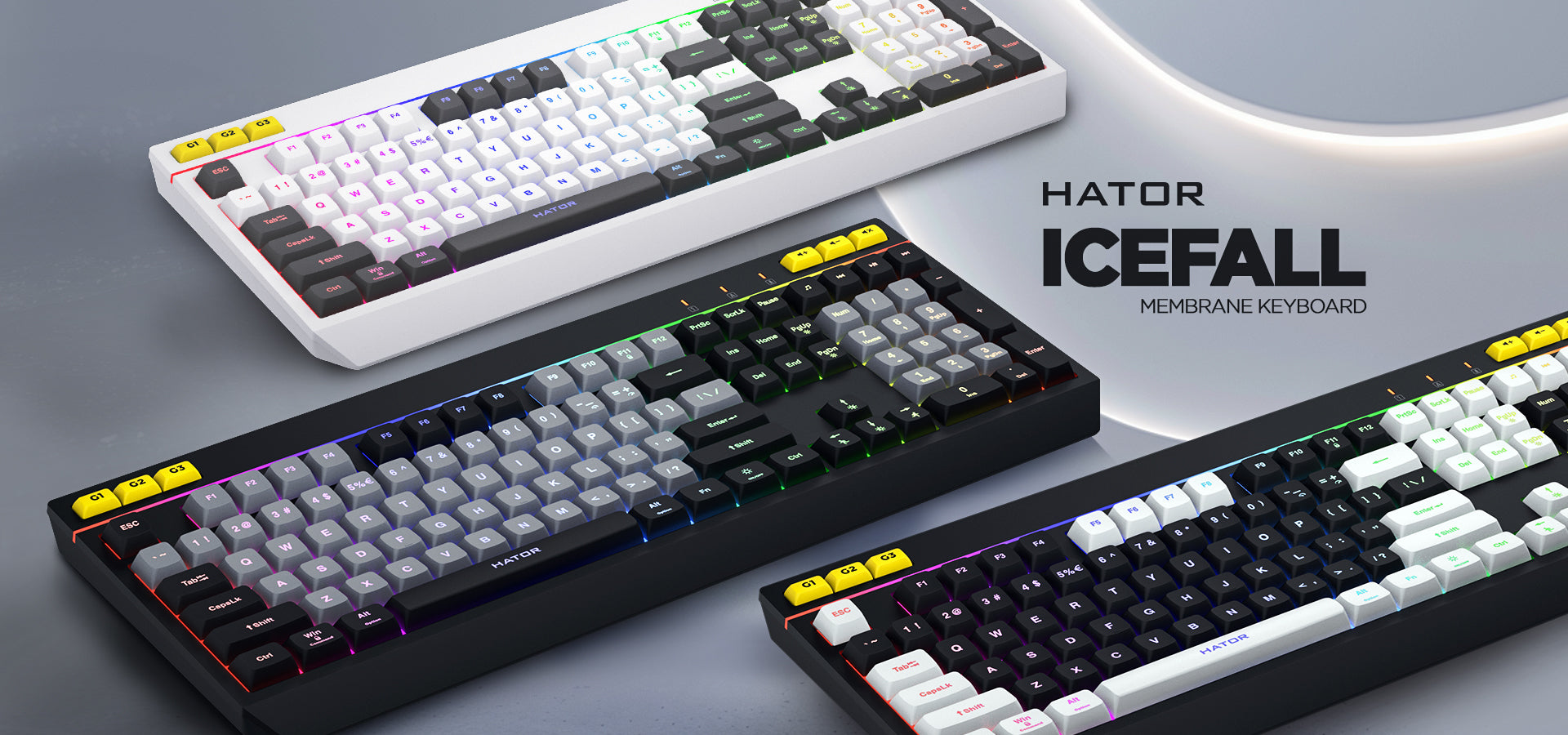 The HATOR Icefall full-size membrane keyboard offers a seamless fusion of performance and style. Designed for both work and play, it features a 1000Hz polling rate for responsive input and whisper-quiet membrane switches that provide a soft, silent typing experience. The standout feature is its vibrant RGB backlighting, divided into 8 customizable zones. With eight preset lighting effects and a dedicated custom mode, users can personalize the look and ambiance of their setup to match their preferences or enhance focus during use. Multimedia control keys and dedicated profile-switch buttons make navigation and task switching effortless and efficient.